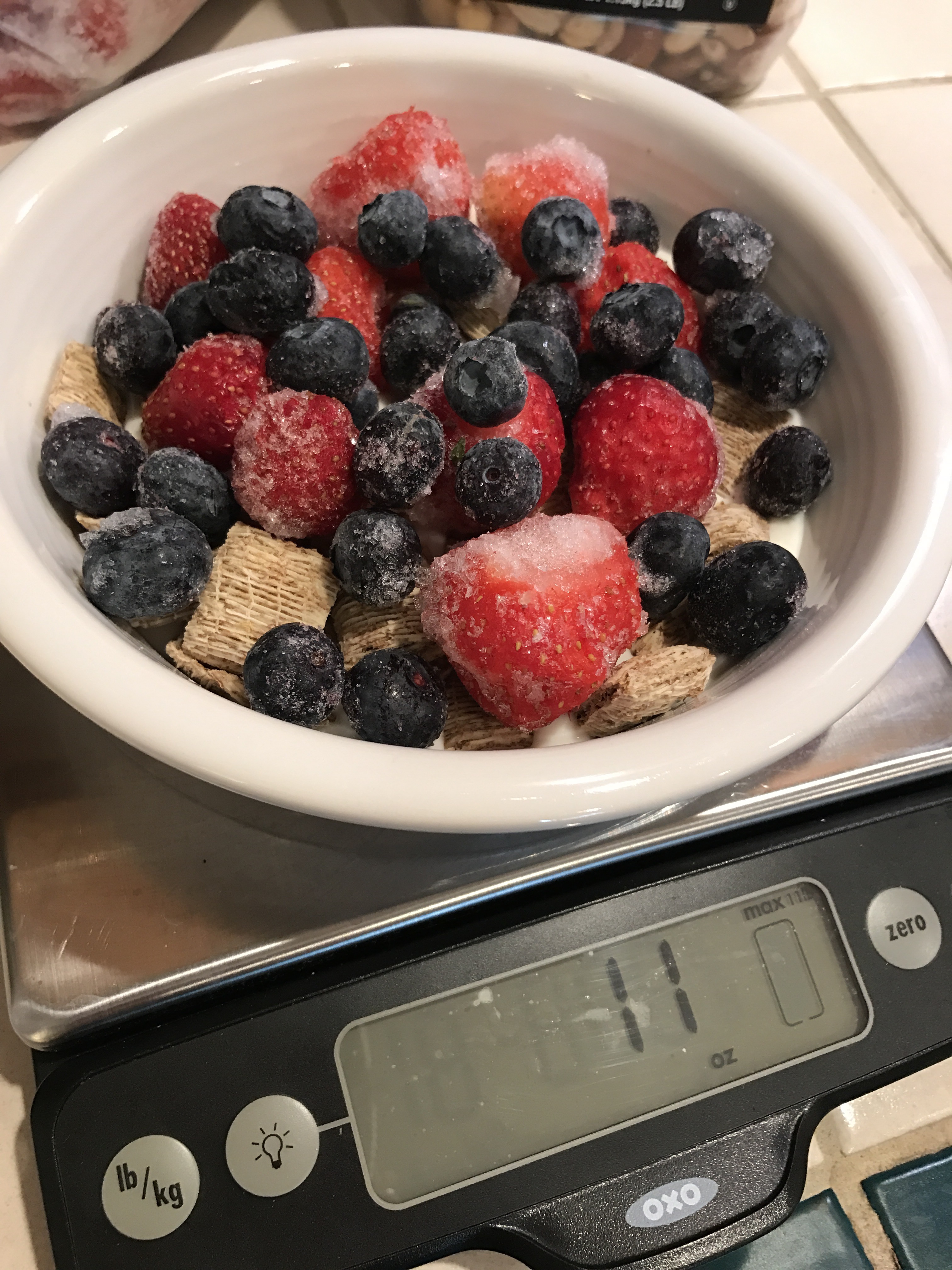 …then keep adding till you get the weight correct on the scale.  4oz yogurt + 1 oz cereal + 6oz berries = 11oz.!