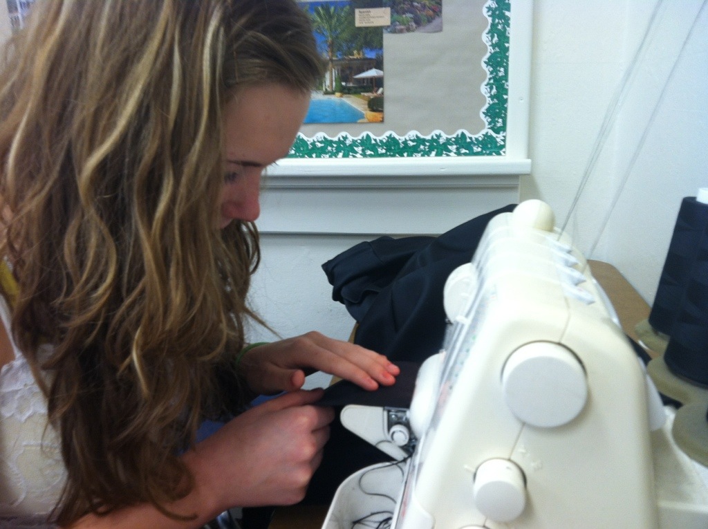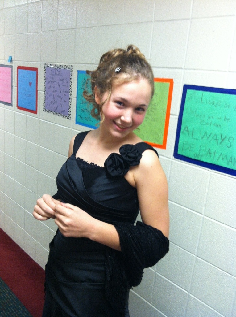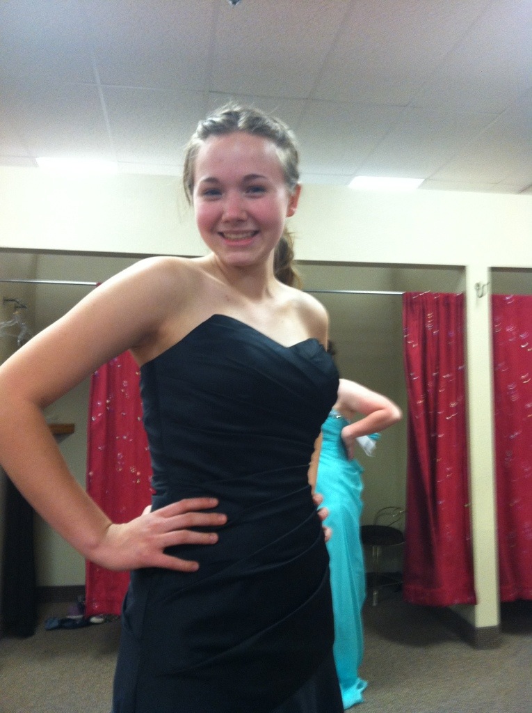She had to modify the dress a bit to make it pass “dress code”. She made and sewed on the 2-inch straps as well as the rosettes. The finished product didn’t look pieced together at all, but was very classy and it fit her perfectly! She also took off about 6 inches around the hem because it was too long for her. I was so proud of her for doing the work herself, and having a finished dress that looked professionally done!