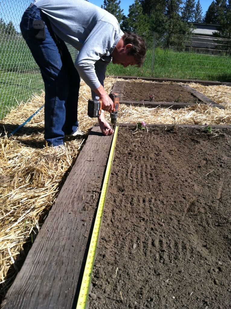 I hope to lay down the water lines today and put the grids on the boxes. Yesterday The Woodman drilled in the screws so we can weave our lines and make our grids.