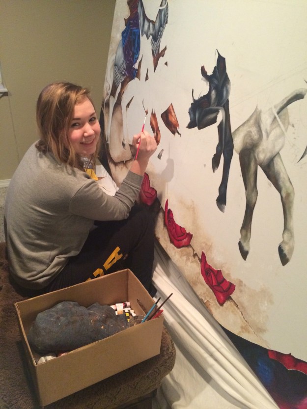 She has taken on this project for her bible teacher to paint a scene depicting portions of the book of Revelation.