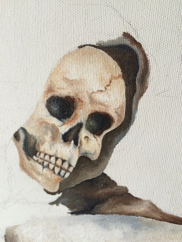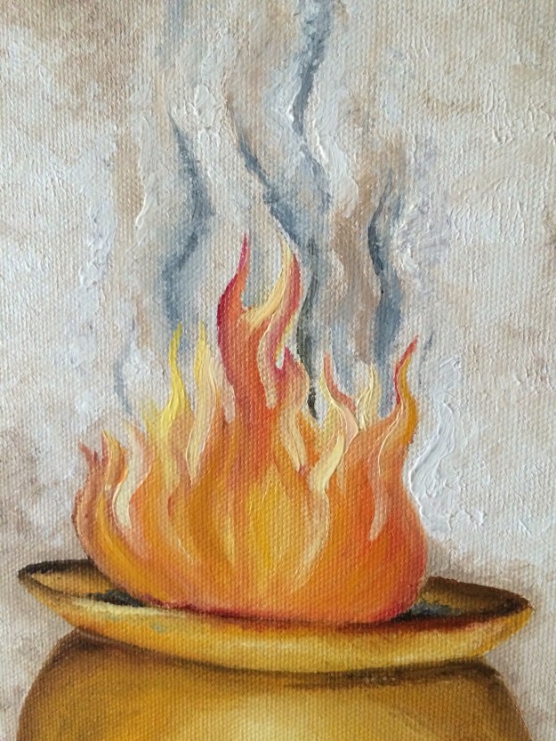 The horses are bursting out of an open scroll, the 7 seals are split, there’s an angry sky and the earth is on the bottom left as well. And there is a lot of white space which will reveal more surprises as she keeps painting.