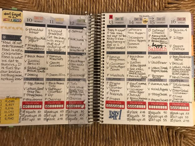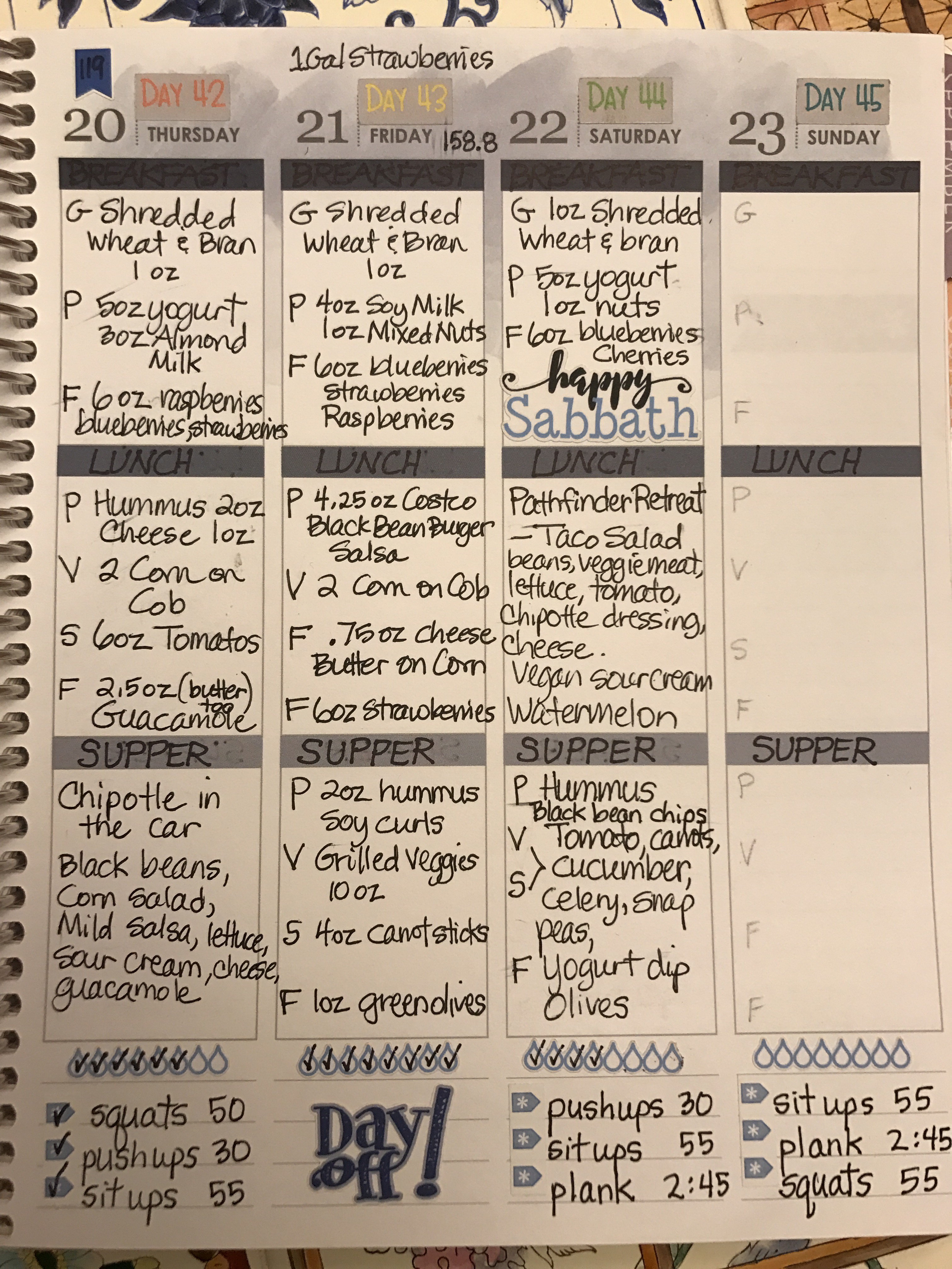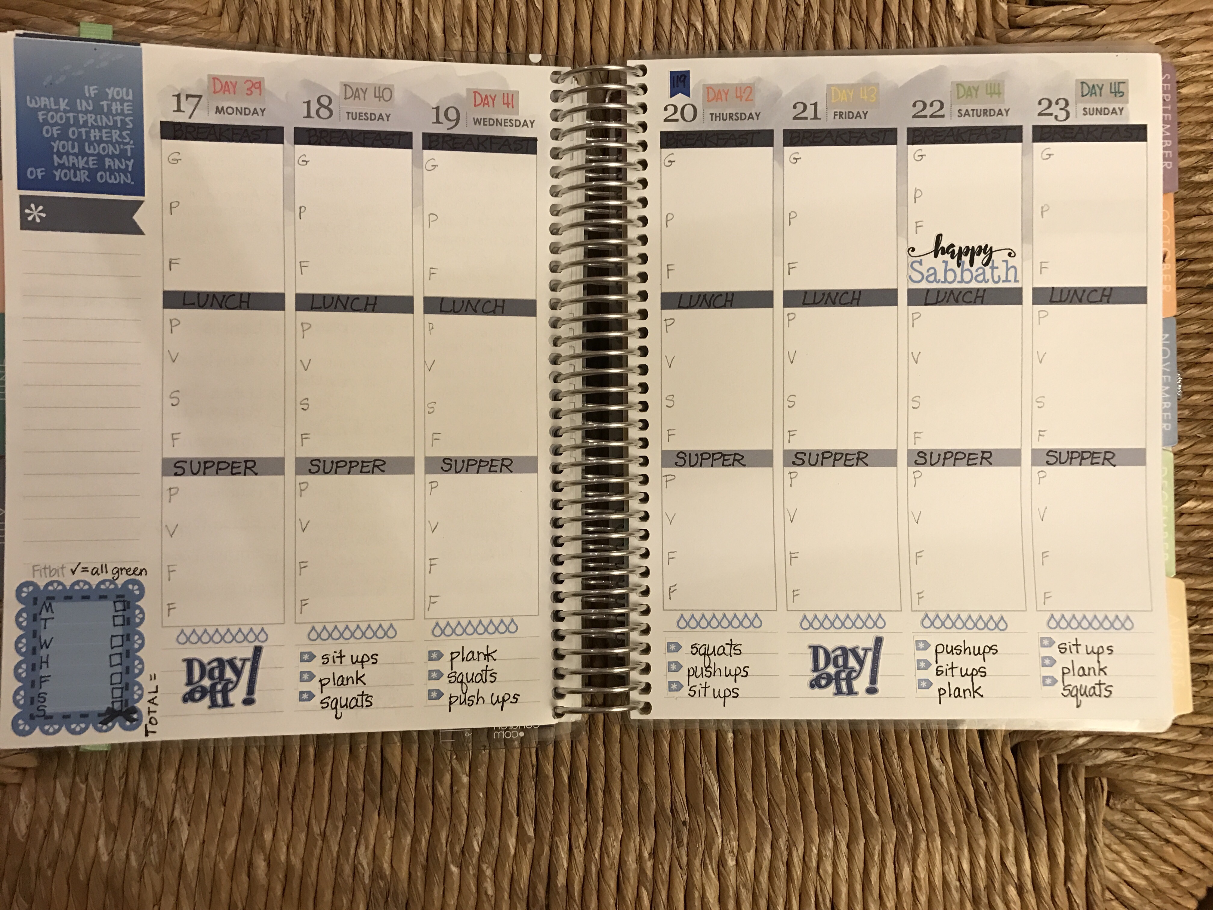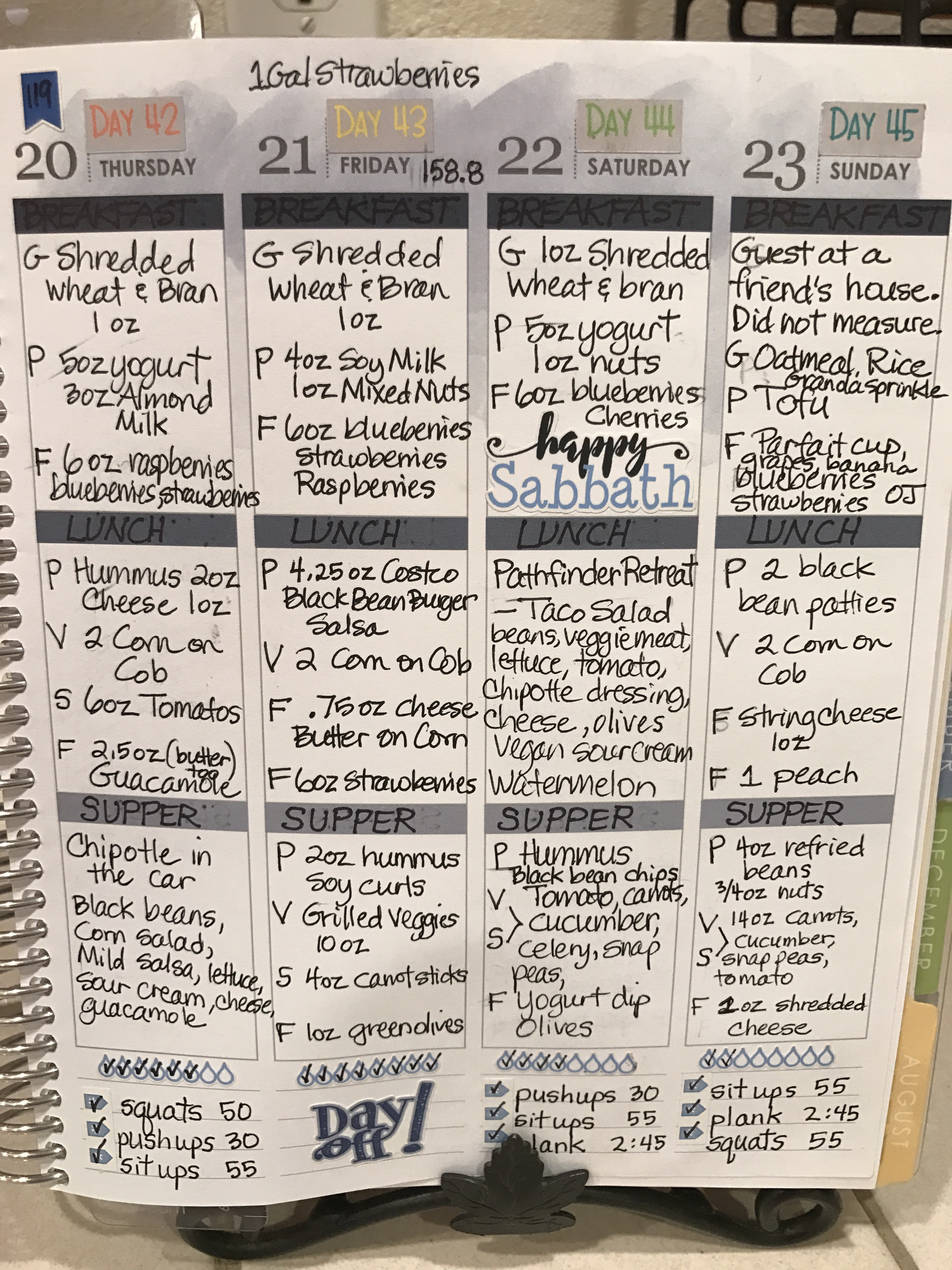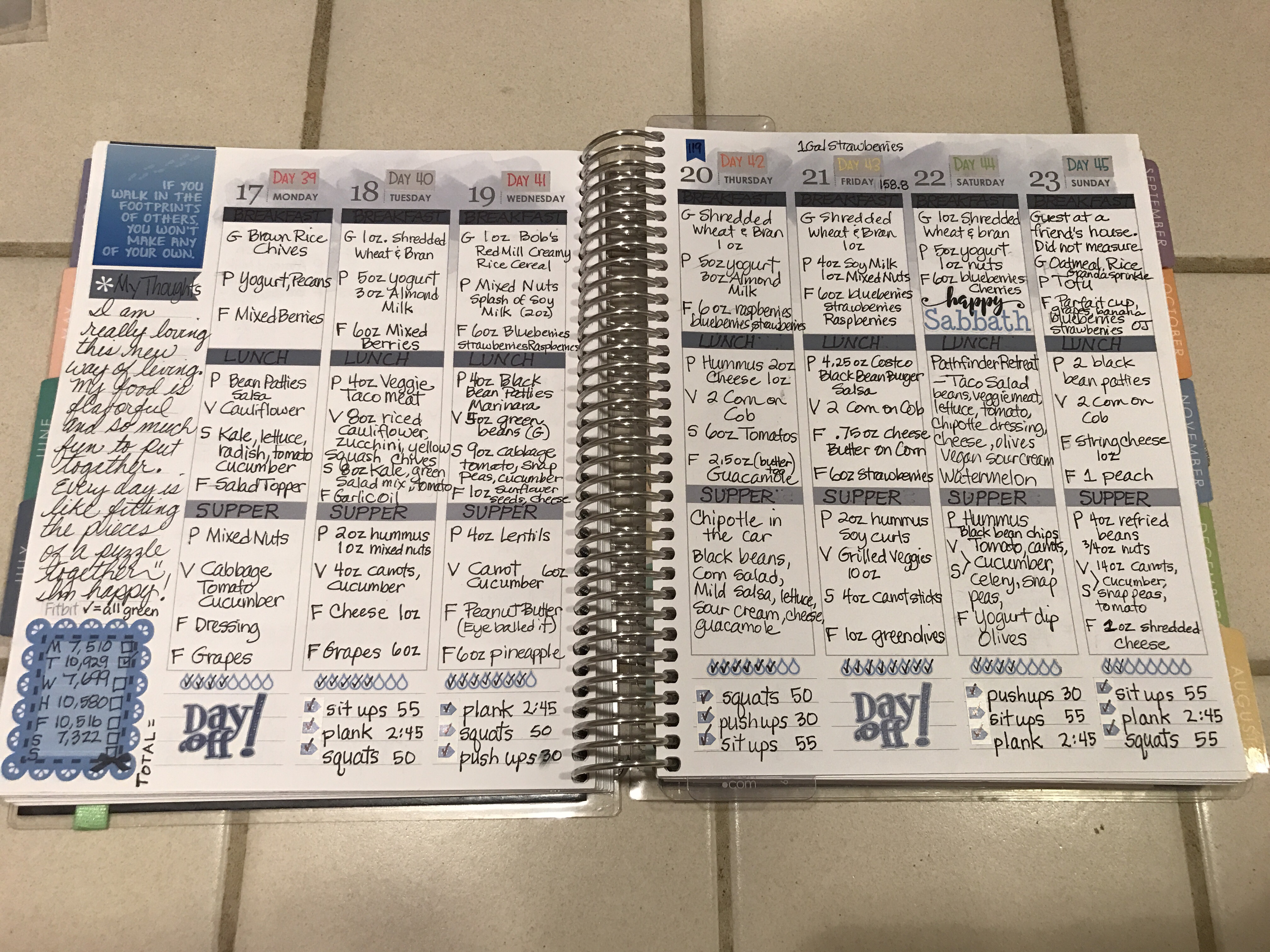 We are jumping in at Day 40!  Here is a quick look at last week in my Wellness Journal. I have been very faithful in planning my food the night before and then just executing my plan each day. This is a key to success with Bright Line Eating!!
