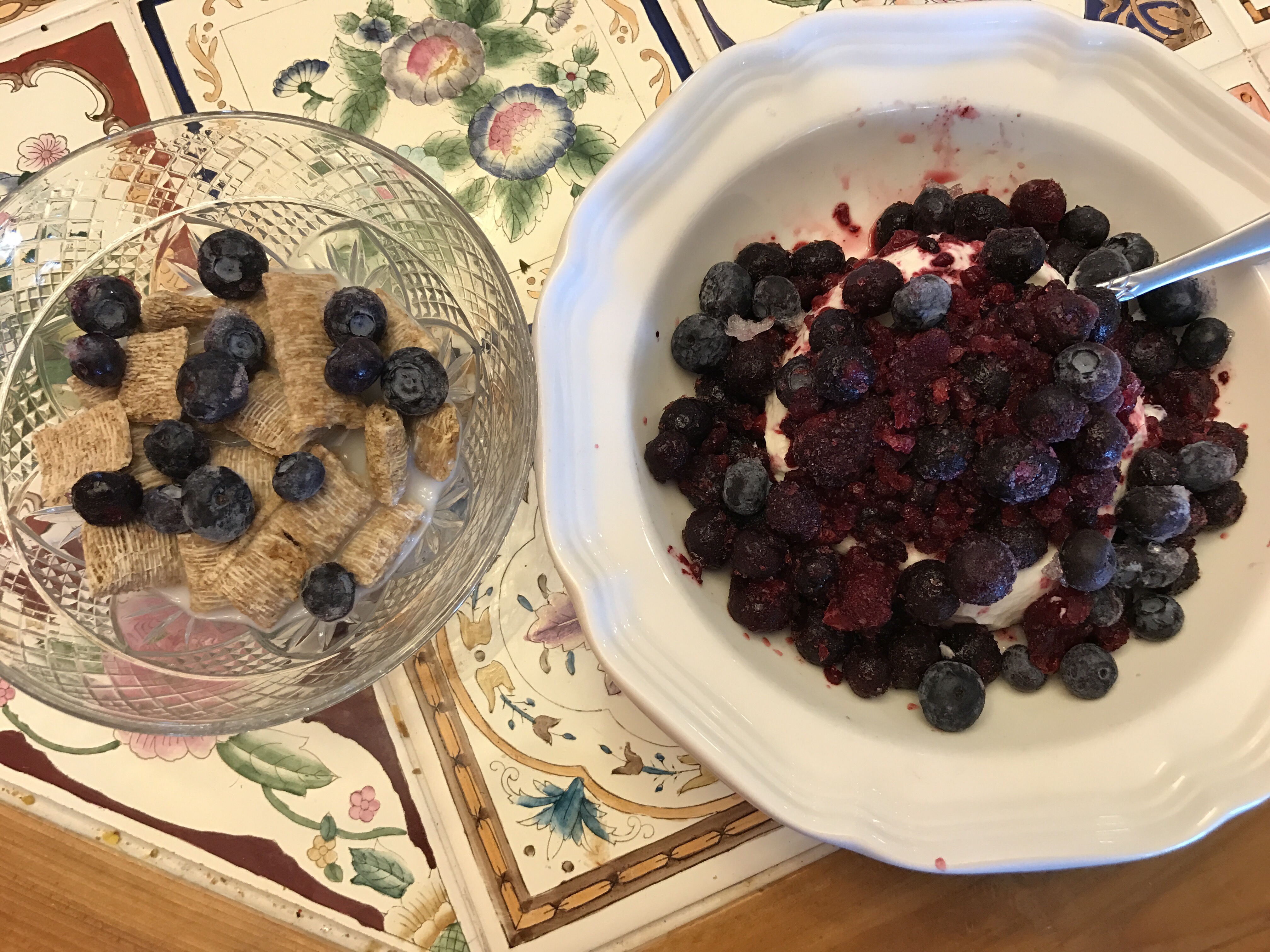 Breakfast was the old standby…Shredded Wheat & Bran, yogurt, and berries from the garden.  The blueberries were fresh picked and the others were in the freezer.  I hope the day will come when we have enough blueberries to need to freeze them, but for now, there are plenty to eat fresh for the next week or so!