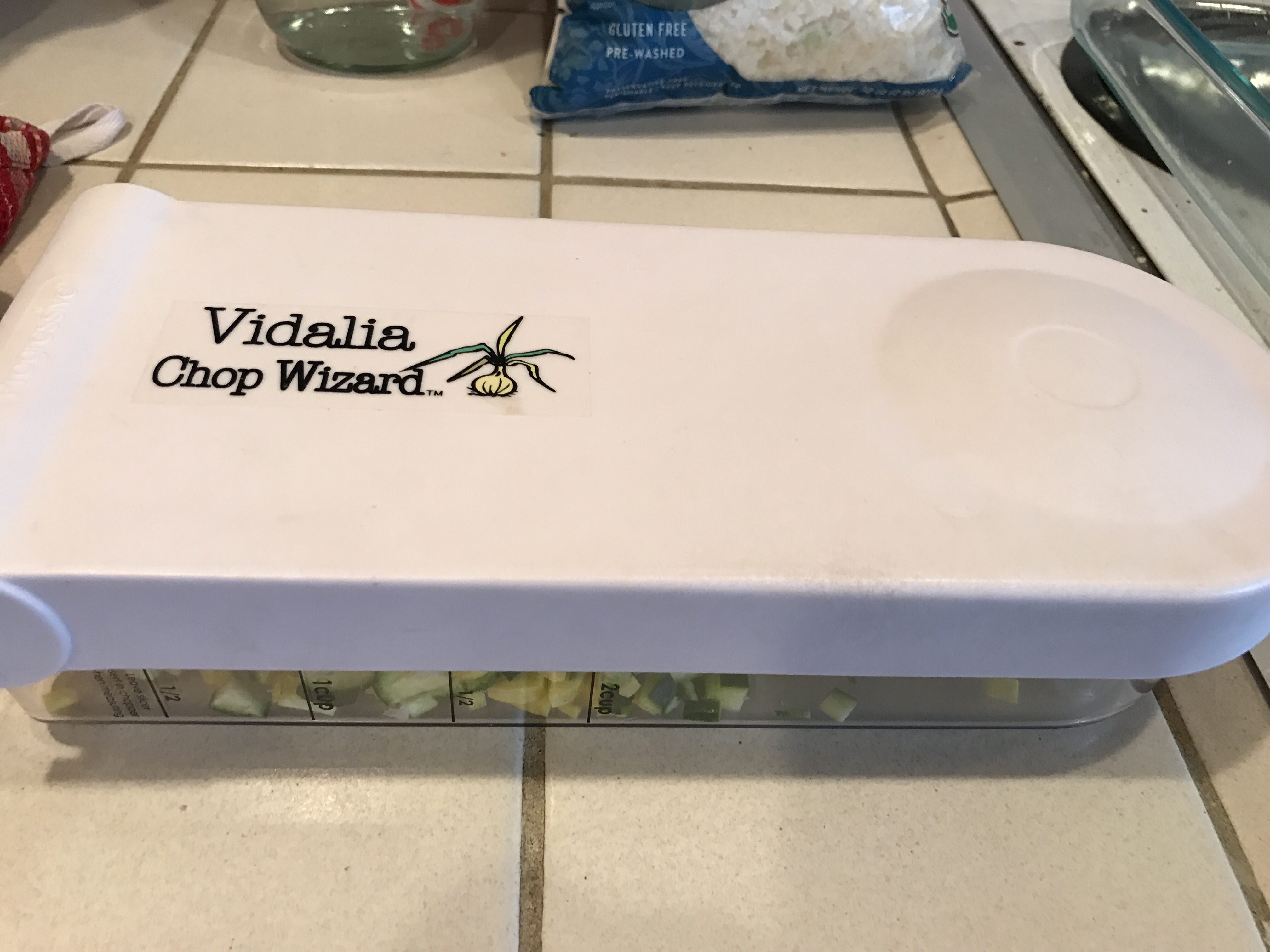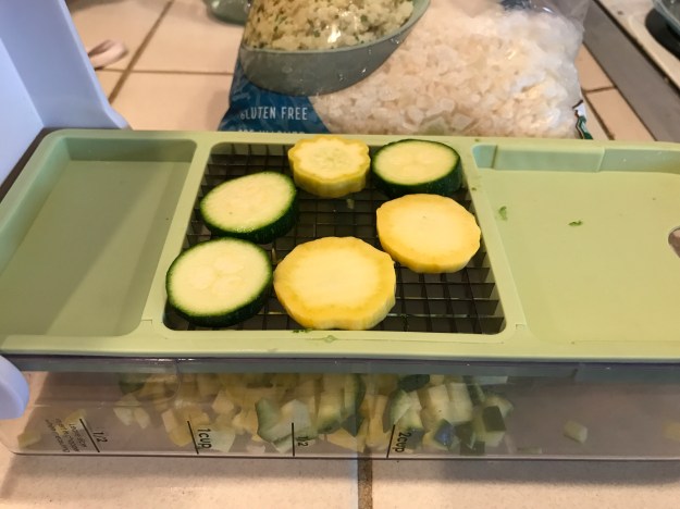 I put both types of squash and my red bell peppers through the chopper.  This sight makes me happy because it was effortless to do.  Cutting these by hand would be too much work and I’d never want to make this recipe.  I bought my Vidalia choppers at Target and through eBay.