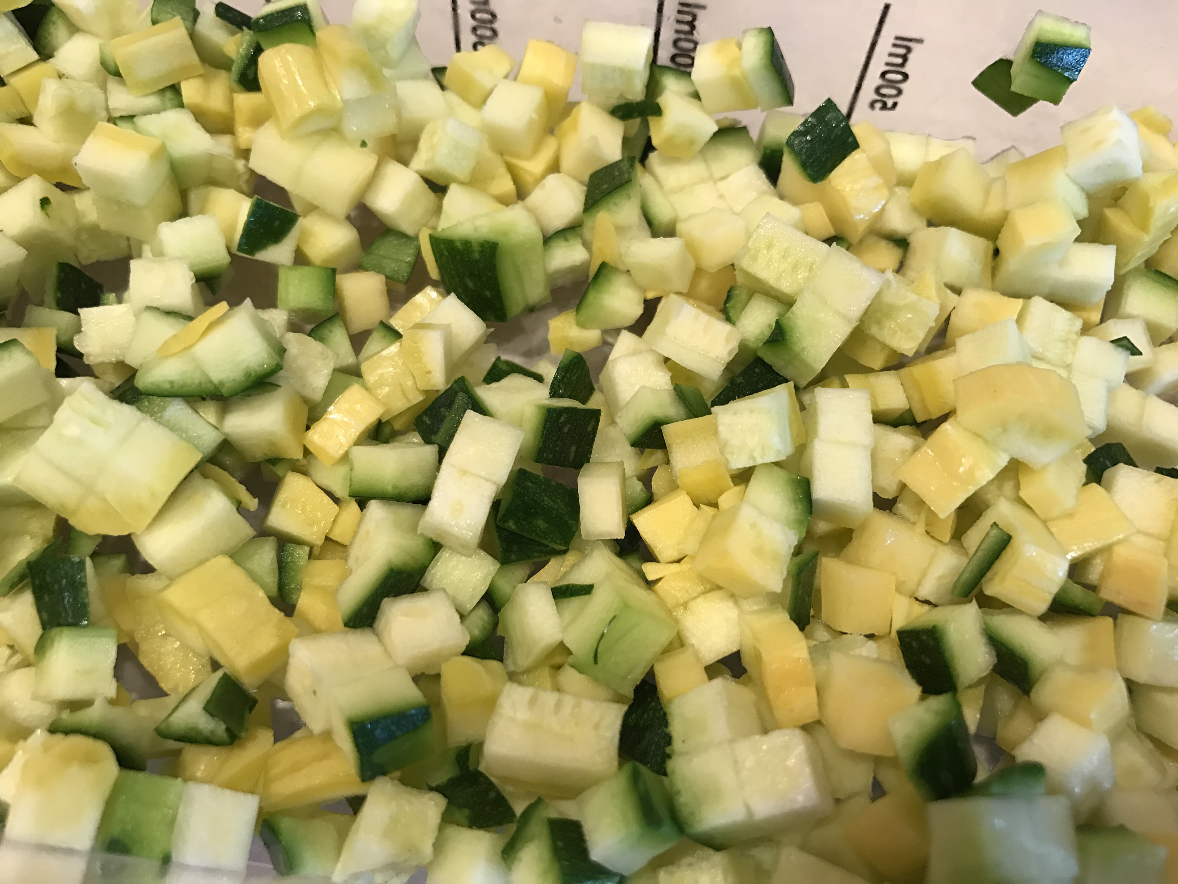 My zucchinis are almost ready to harvest so I hope this is the last one (these are organic) that I’ll have to buy from Costco.  The yellow summer squash is from the garden at the elementary school and I love knowing that my food is coming straight out of a pesticide free garden!