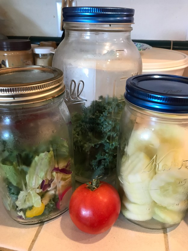 I set my burner on low and began dumping my salad together. Since everything was basically prepped and already in quart jars, the salad was a snap to make. The tomato and kale are from our garden!  I love this time of year!