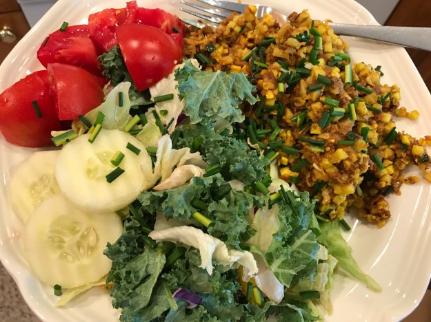 My supper tonight was completely from the garden, except for the tofu.  Everything was delicious and again, so rewarding knowing that we grew it ourselves!! I didn’t eat the kale leaf and completely forgot that I could have added a fat to this meal.  Oh well!!
