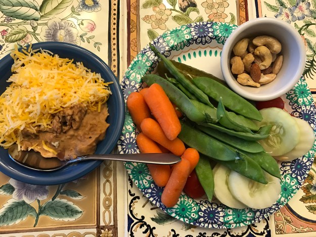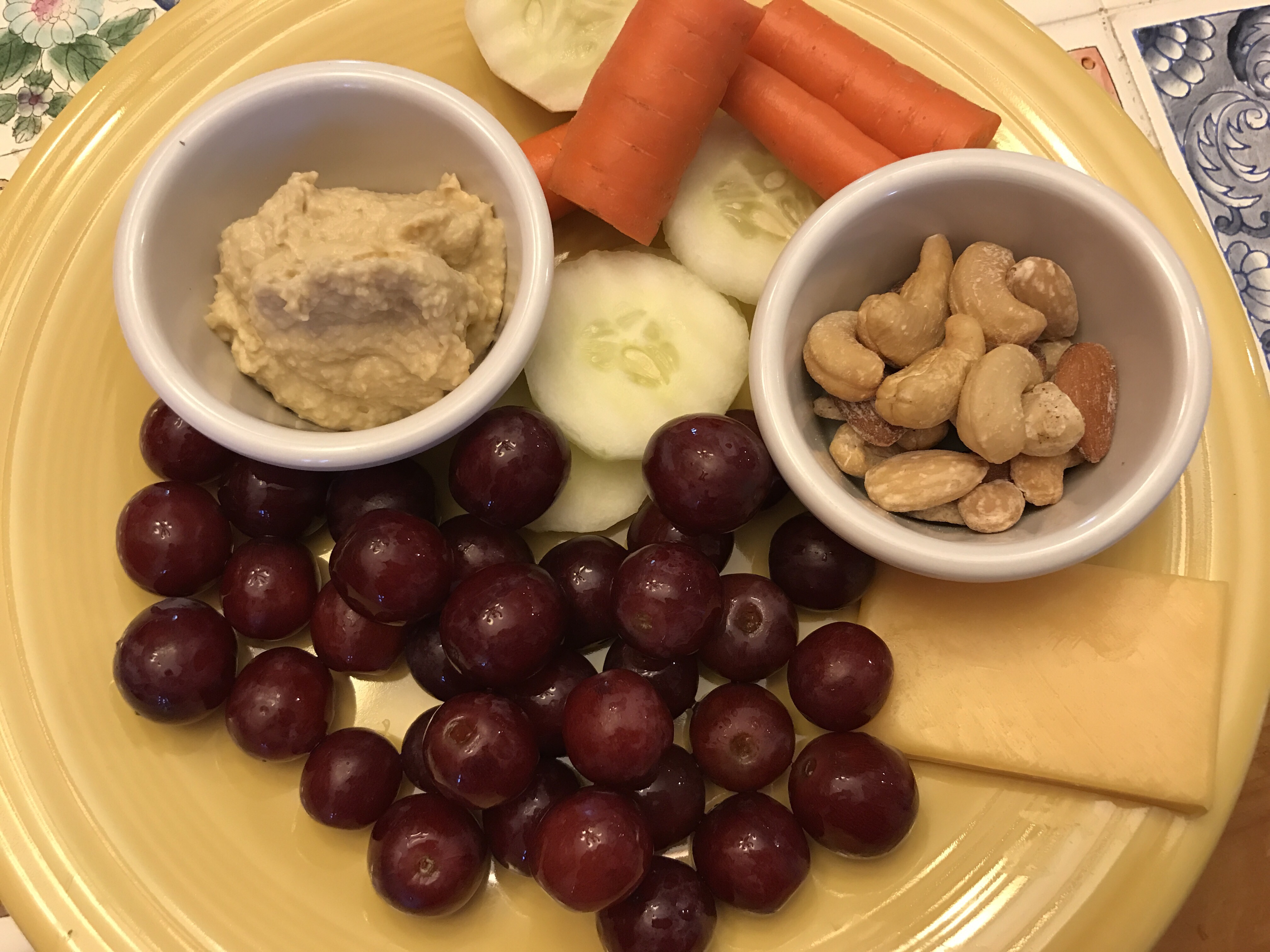 This evening a friend invited me to go on a small hike and take a dip in the lake.  I grabbed 2 packs of mixed nuts, a cheese stick, some garden snap peas that I pulled out of the shells, and some carrot sticks and ate them in the car while we drove to the lake.  We ended up having a girls’ night with four of us and we enjoyed the evening, the sunset, and the friendship!