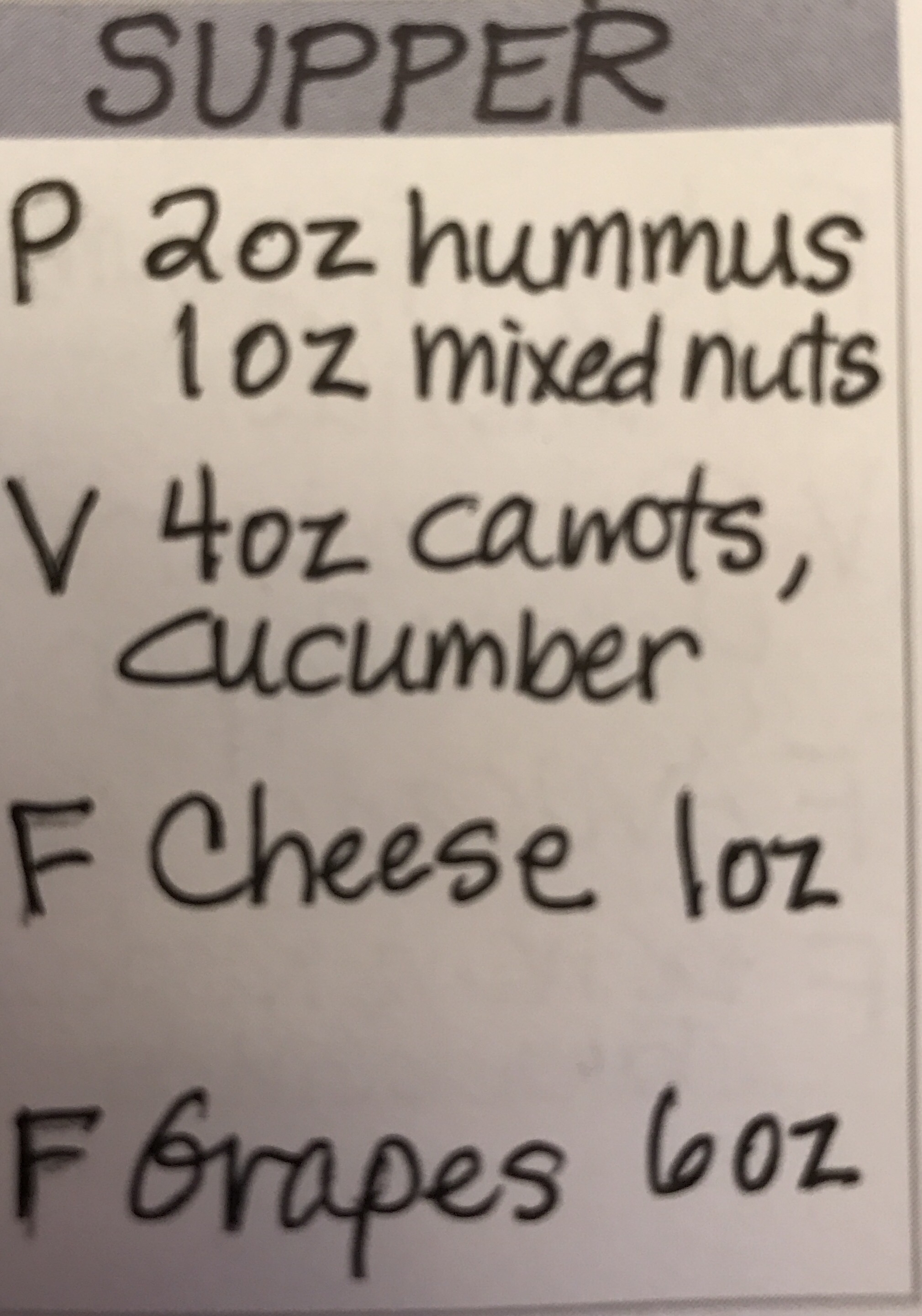Supper turned out to be a GREEN meal!!  I didn’t mean for that to happen, but after my food was all on my plate I realized there was no pop of color in my food!  I didn’t let it bother me.  I was really hungry by the time I ate supper and spiralized zucchini with marinara and parmesan is always super yummy!!  I wasn’t sure how to count the edamame beans or the parmesan cheese so I just used 1 ounce of each and called it a meal.  After investigating, I discovered that I had done it correctly and stayed within the lines!