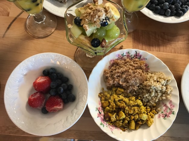 I ate breakfast at my friend’s house because we had to do some planning for Pathfinders and we decided to share brunch before we got down to business. When I’m invited to another person’s house, I do not bring my scale to weigh food. I’m fairly certain my proportions weren’t right on and I think I was over on both grain and fruit. But it was a lovely time and the food was wholesome and delicious. The hostess even made the hot cereal without sugar which was super sweet of her!