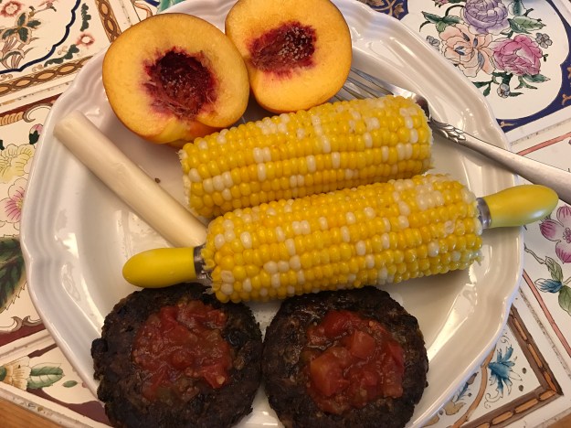 Lunch was a quick meal at home. I’m still enjoying my homemade black bean patties with salsa or marinara and these came out of the freezer to be heated up. The corn was from Costco and I’ve been enjoying it all week. We also had Costco peaches and string cheese is always easy. It’s like a lunch of doubles!  I should have cut my cheese in half so there was two of everything!